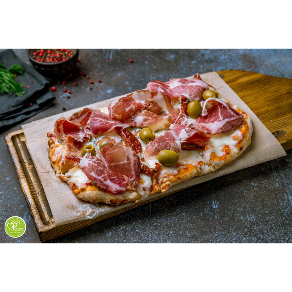 Prima di servire e gustare la tua pinsa, guarniscila con fette di coppa, olive verdi denocciolate e un filo d’olio extra vergine d’oliva